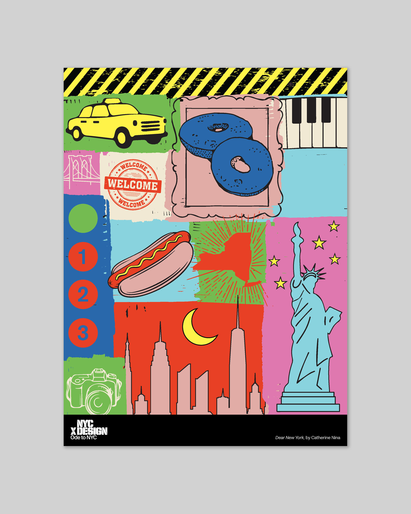 From designer Catherine Nina: "From my first days as a student here, this city welcomed me with open arms. I found kindness in strangers, inspiration in the culture, and the freedom to grow into the person I wanted to be. From the rush of yellow cabs to late-night hot dogs on the corner, from warm bagels in the morning to the glow of city lights that never fade, every moment here is electric. New York is more than a place. it’s a feeling, an energy, a dream. This poster is my love letter to the city that lets me be anything."