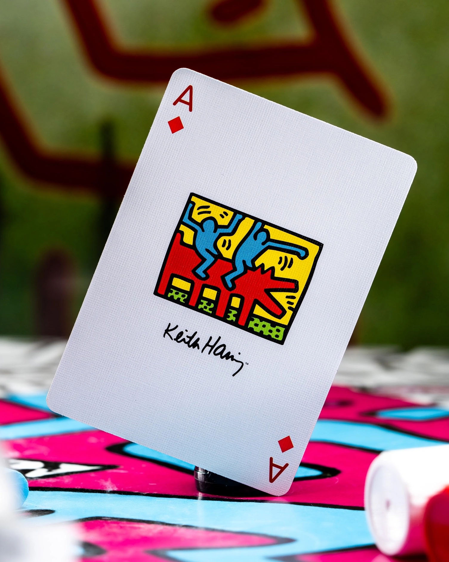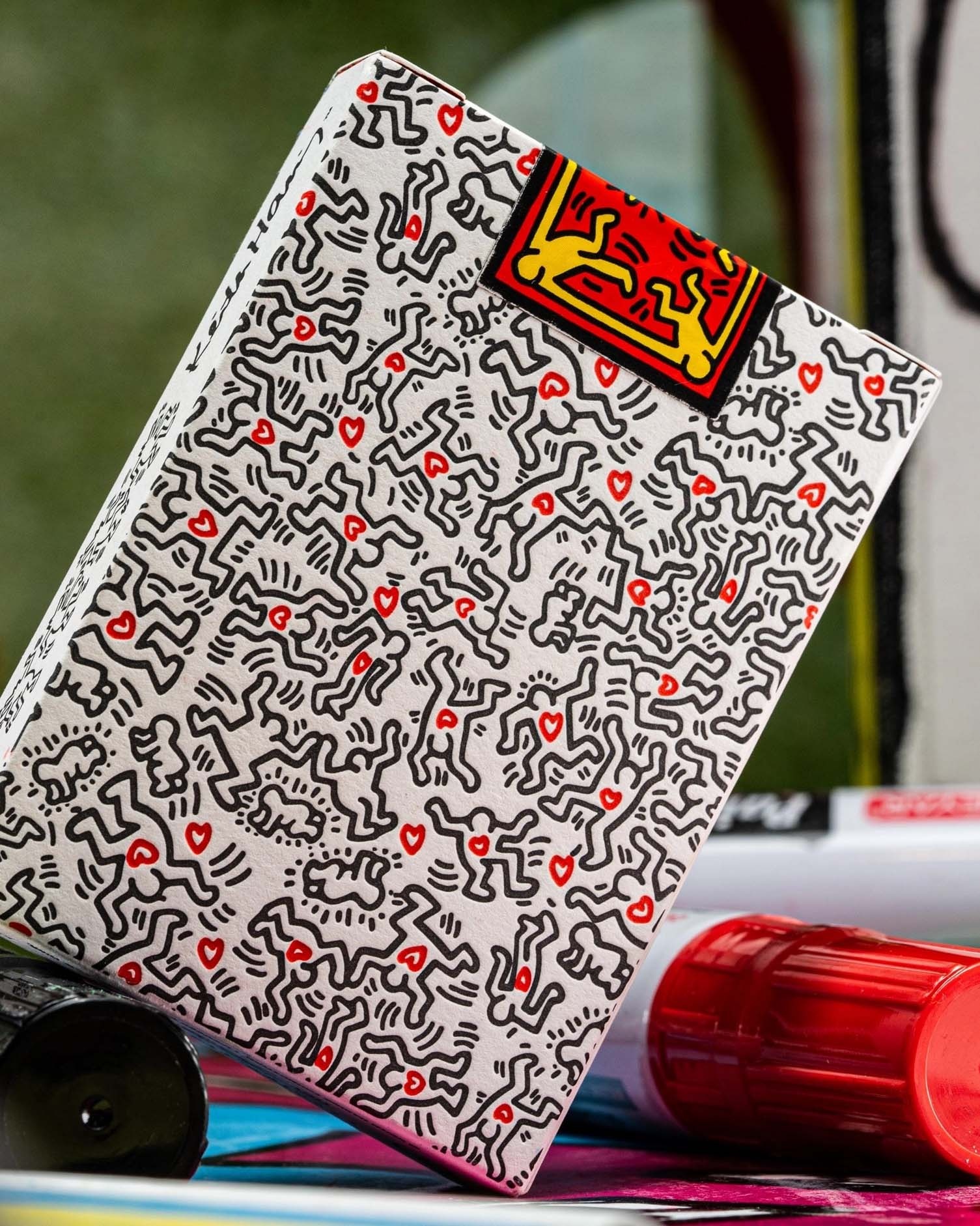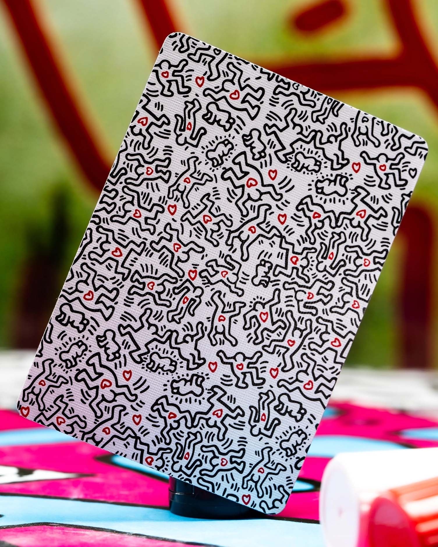 Step into the vibrant world of iconic artist Keith Haring with premium playing cards that showcase his distinctive patterns and forms.
