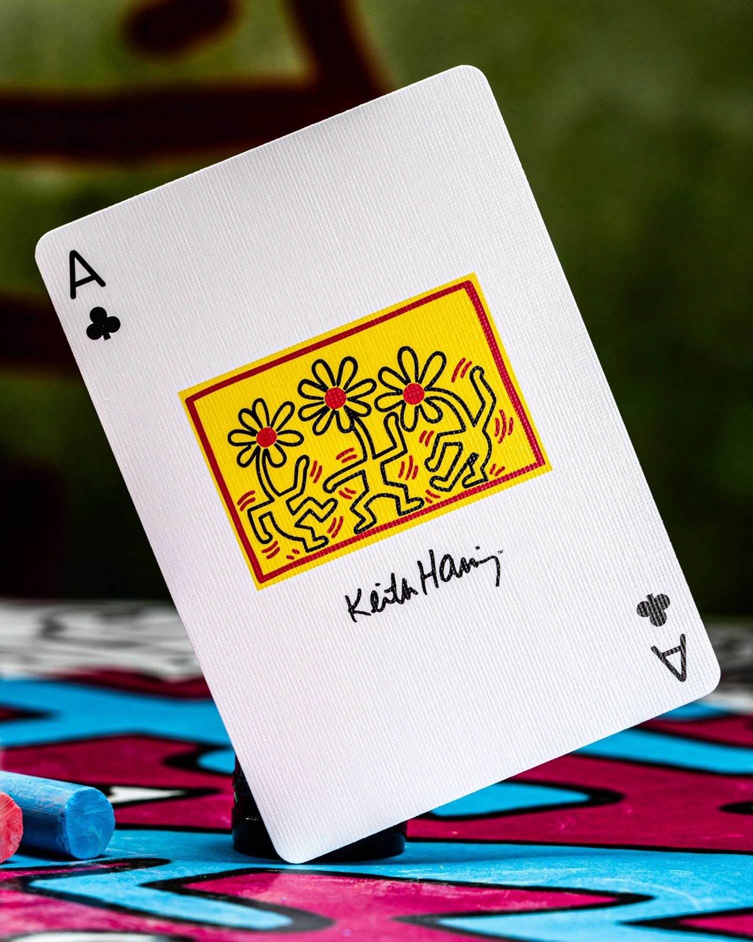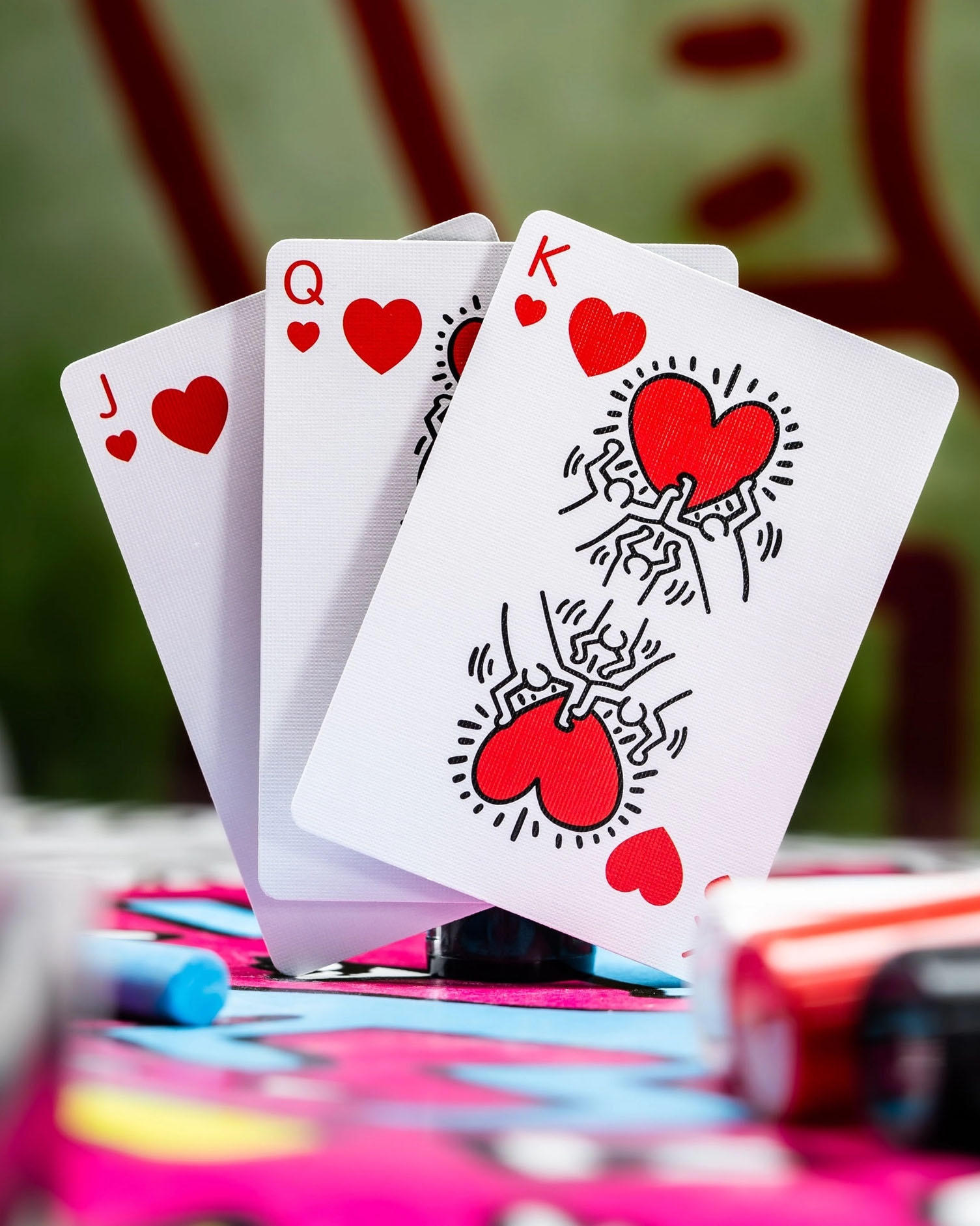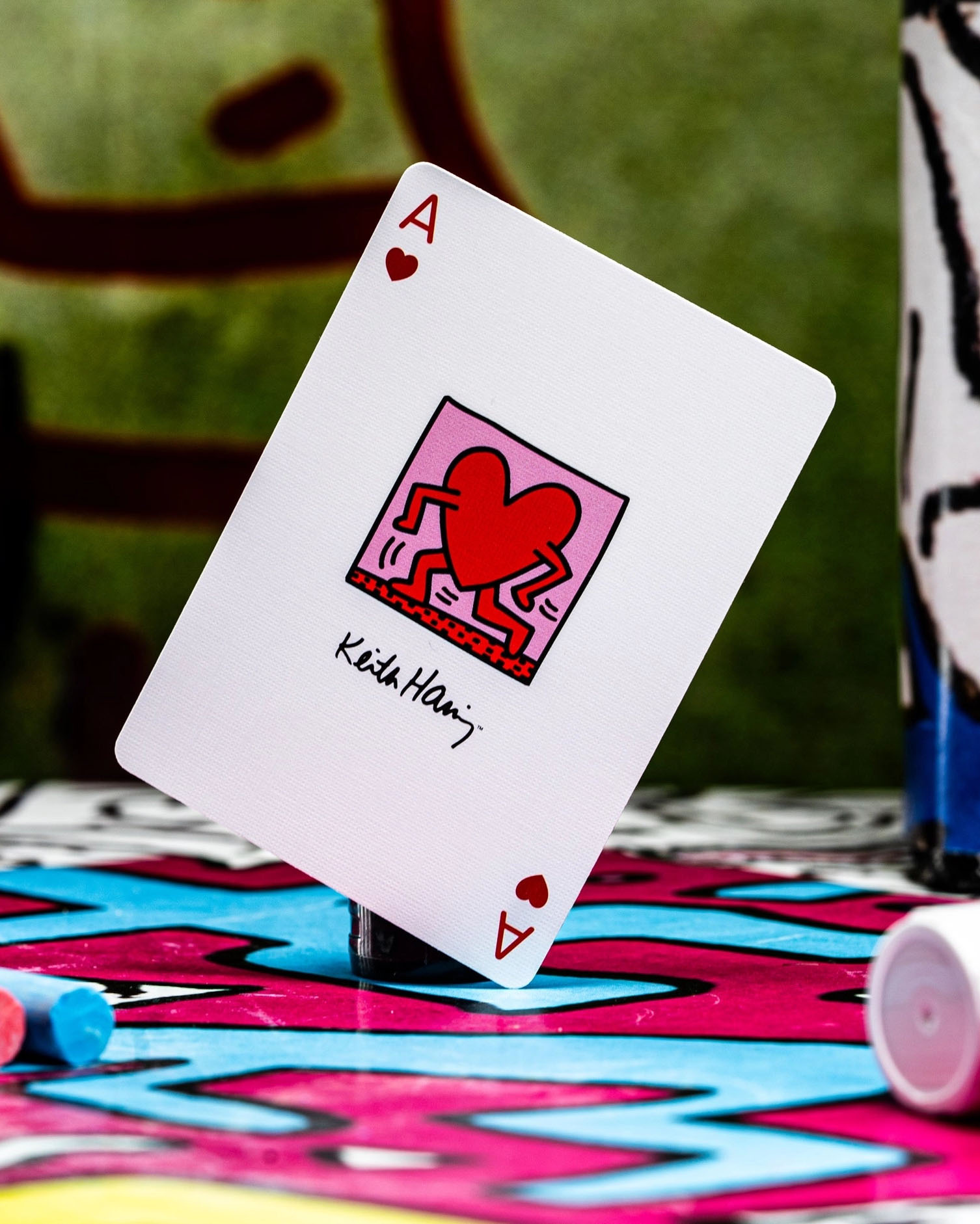Step into the vibrant world of iconic artist Keith Haring with premium playing cards that showcase his distinctive patterns and forms.