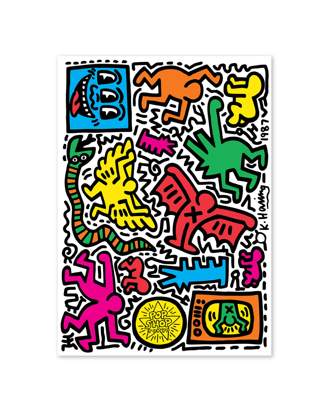 In 1987, Haring made a giant sticker sheet for his Pop Shop Tokyo. This premium vinyl sticker sheet is inspired by this classic. Silkscreened with love, including 14 iconic Haring characters and a commemorative back print.