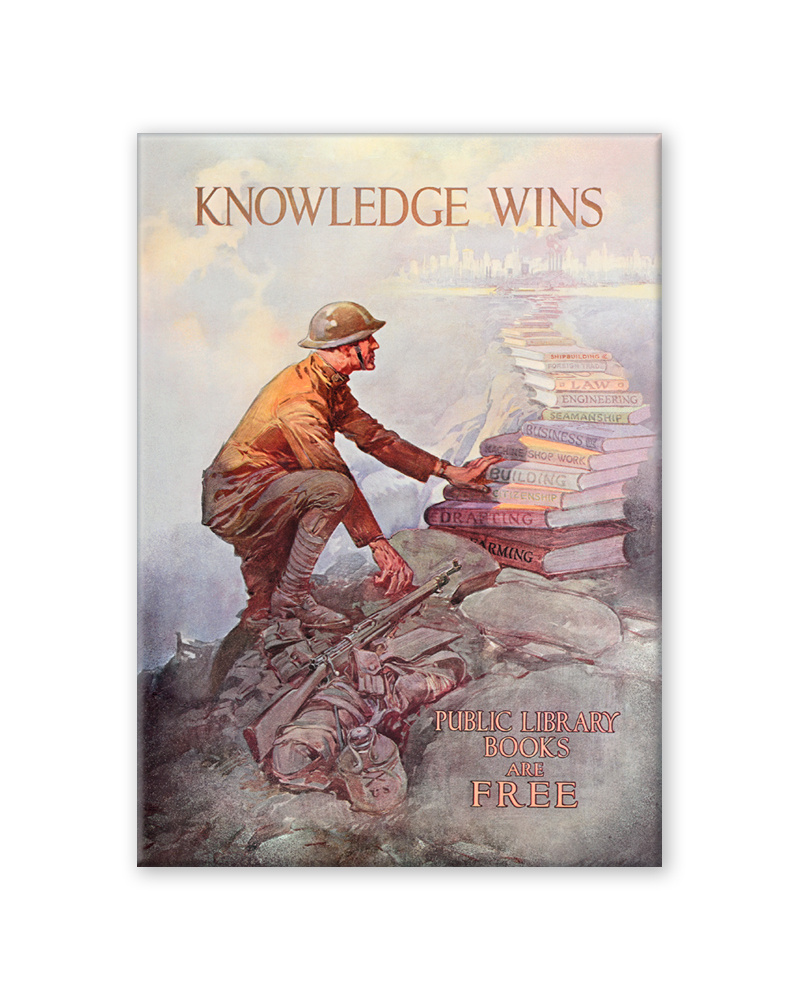 Since it had supplied millions of books to troops during World War I, the American Library Association anticipated that a soldier's love for books would continue once they returned home. This poster shows a soldier laying his gun and gear on the ground and preparing to climb a staircase of educational books leading toward a shining city and busy factories, visually emphasizing the poster’s message that knowledge would provide a path to opportunity after the war.