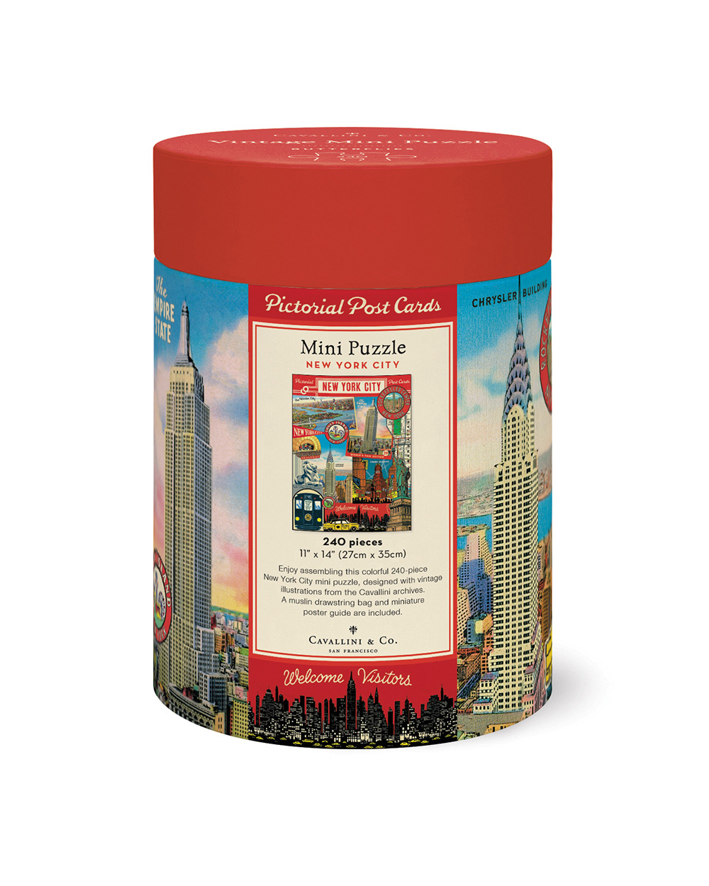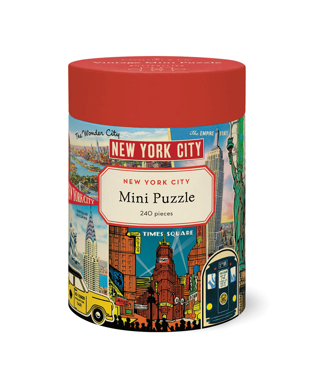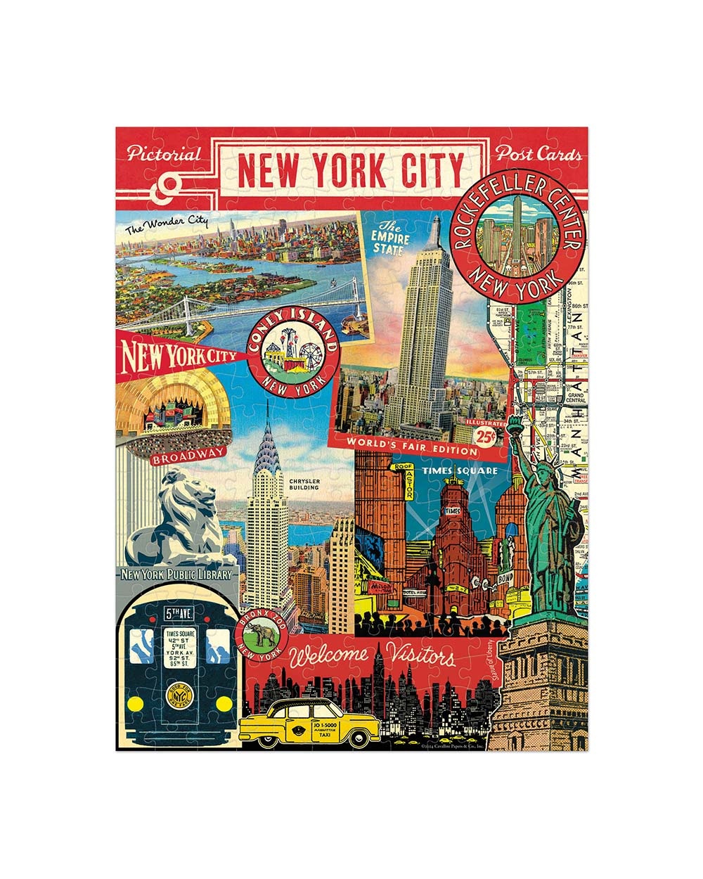 Enjoy a quick jaunt through New York City with this 240 piece puzzle! Featuring a collage of vintage postcards and ephemera, you can spot all your favorite landmarks and discover how New York City was advertised over the years.