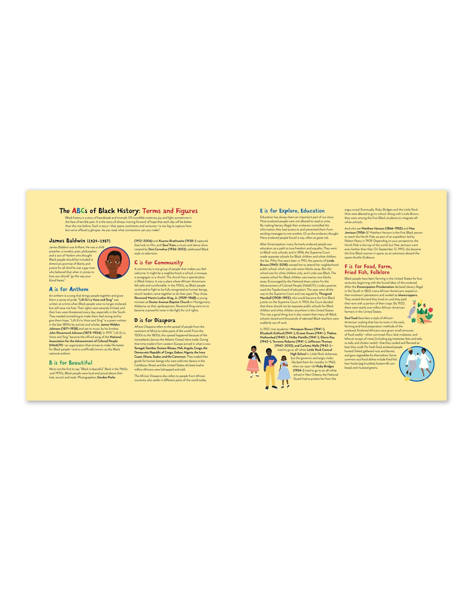 In addition to rhyming text, the book includes back matter with information on the events, places, and people mentioned in the poem, from Mae Jemison to W. E. B. Du Bois, Fannie Lou Hamer to Sam Cooke, and the Little Rock Nine to DJ Kool Herc.