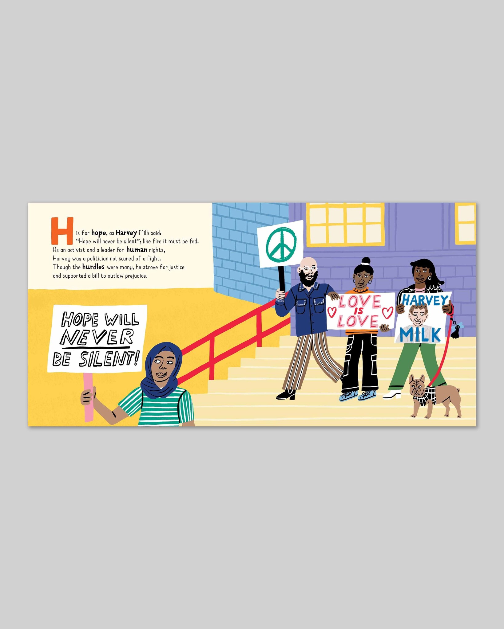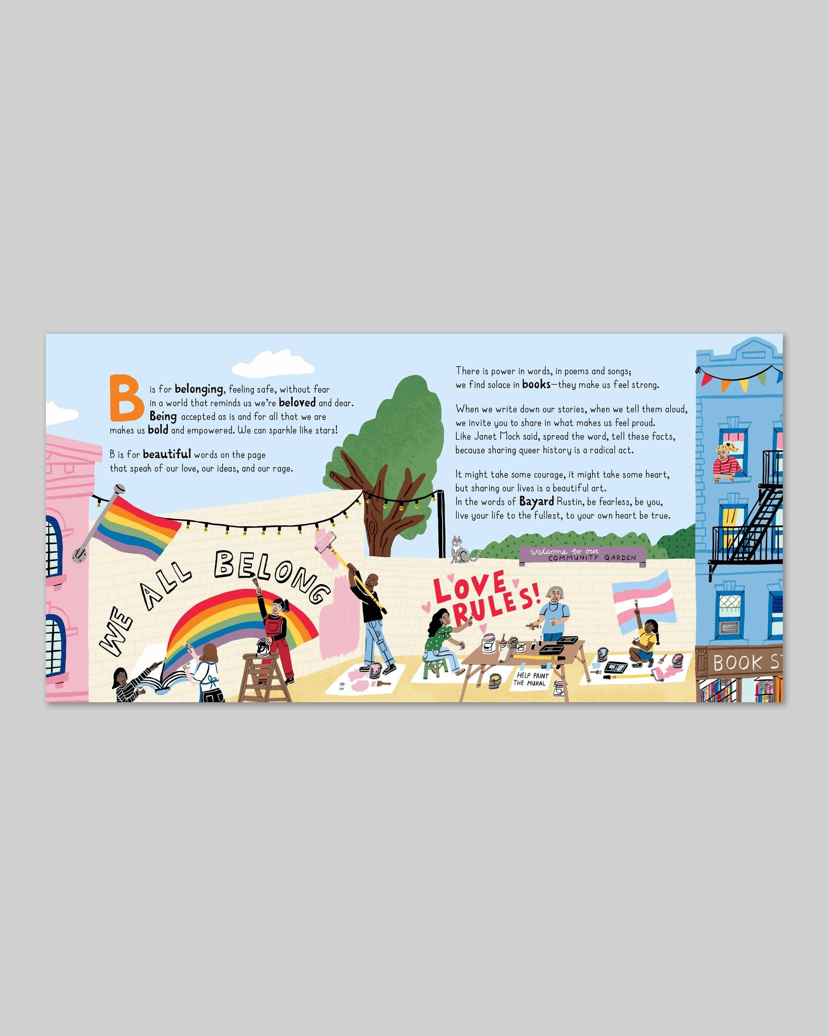 This is a book of people, of ideas, of accomplishments and events. It’s a book about Allies and Ancestors, about Belonging and Being accepted, about Hope, Knowledge, and Love. About historic moments like Stonewall, and how it changed the world. And all about Trailblazers, like Audre Lorde, James Baldwin, Josephine Baker, Harvey Milk, Barbara Jordan, George Takei, Elliot Page, and Sally Ride.