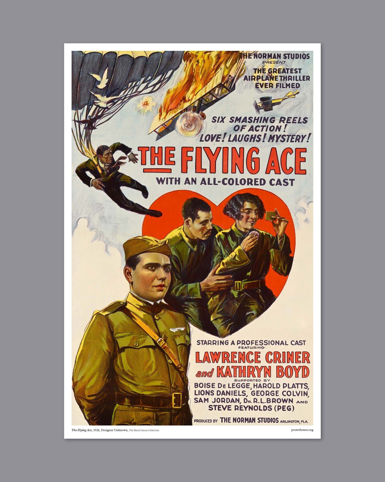 All of the posters promoting the film use action-packed language that emphasizes the daring stunts of the performers. In reality, the flight scenes were simulated on land using a model plane. The plane in the poster is meant to be a Curtiss JN Jenny biplane—the aircraft Coleman was flying at the time of her tragic death.