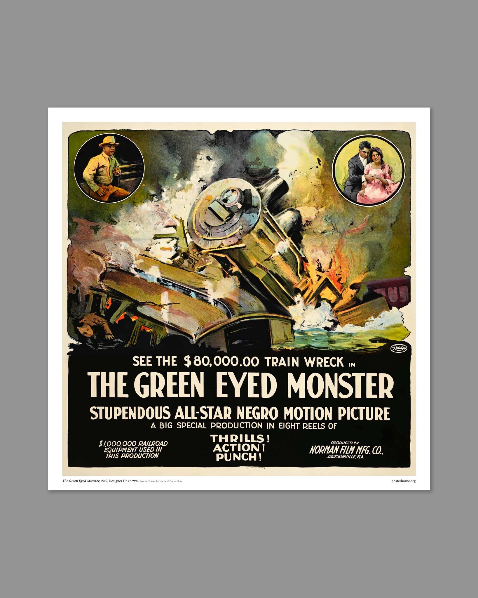 The Green Eyed Monster is considered a lost film, although surviving material indicates that it was a comic drama about greed in the railroad industry and also featured a love triangle. The film's six-sheet poster highlights the exceptional cost of producing the film, including an $80,000 trainwreck (approximately $1 million today) and a million dollars worth of railroad equipment (approximately $18.5 million today). These figures may not be entirely accurate as such numbers were often exaggerated and sensationalized on advertising materials by silent film companies of the day. Current research indicates that the film actually used old stock footage for the train wreck rather than paying a fortune to stage a new one.