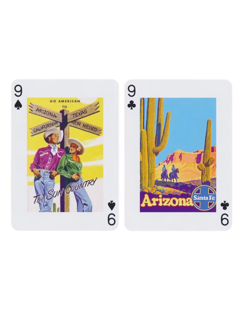 A high-quality deck of playing cards featuring vintage USA travel posters. A panorama of a golden era in advertising, showcasing America's clear skies and scenic train corridors.